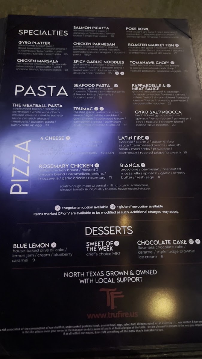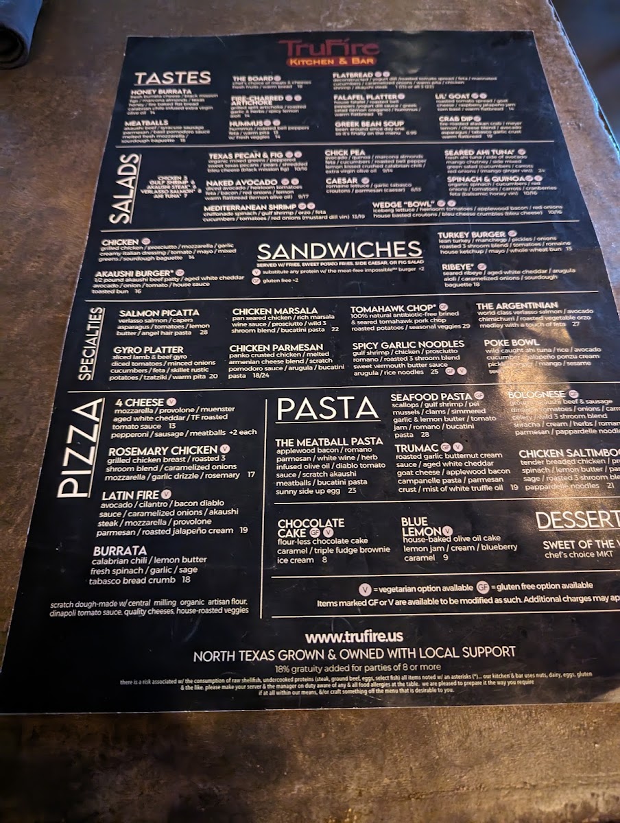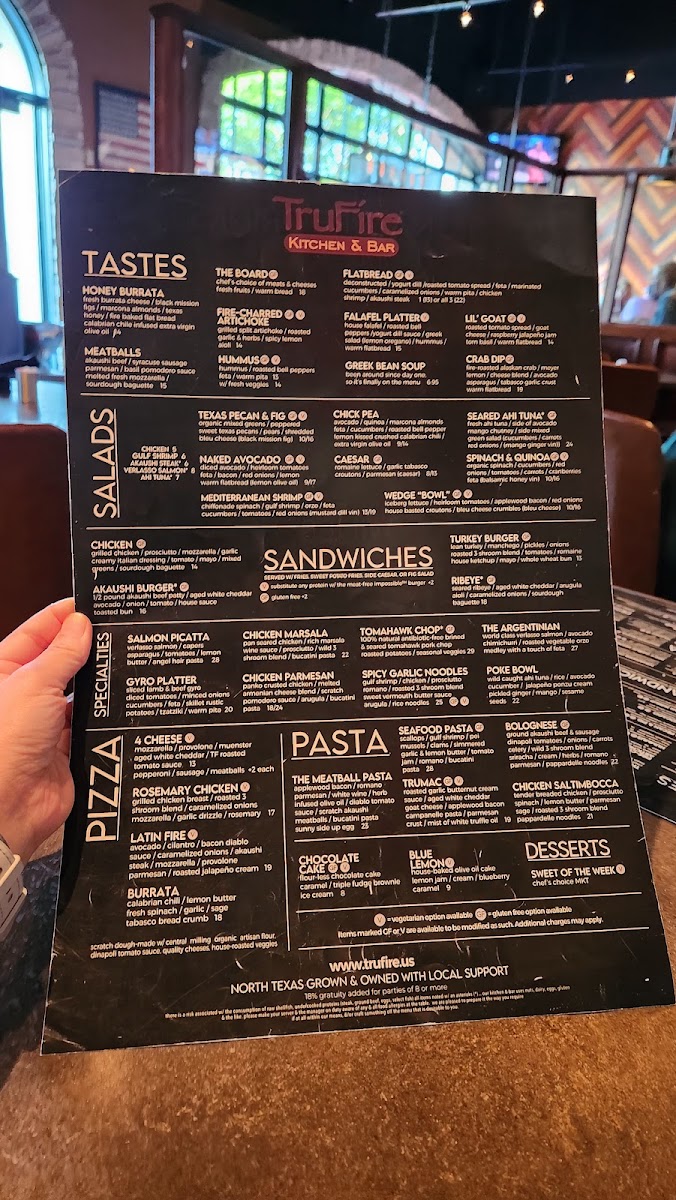 “ Great place with excellent ambience, food, and service. They have a lovely, quiet patio, for those days when the weather's nice. We started with the flatbread, which was very tasty, and for our entrees had the Spinach and Quinoa Salad, Trumac Pasta, and the Four Cheese Pizza with Pepperoni. All were excellent, seasoned to perfection, with perfect ingredients. They also offer a varied wine list and our waiter was very knowledgeable about each offering. We also had one of their Blood Orange Margaritas and it was tasty. Service was friendly, unobtrusive, and very helpful. Located in the Shops at Starwood off Lebanon Road in Frisco, there's ample parking and easy access. And after your meal, you can stroll through the people-friendly shopping center with lots to see. I would highly recommend you give TrueFire a try! ”